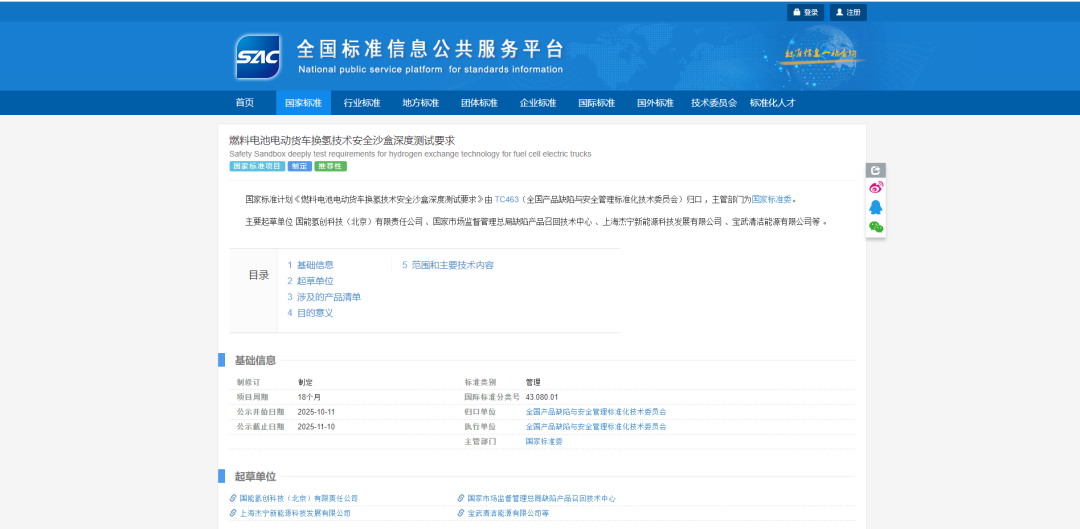 关注 | 国家标准《燃料电池电动货车换氢技术安全沙盒深度测试要求》拟立项