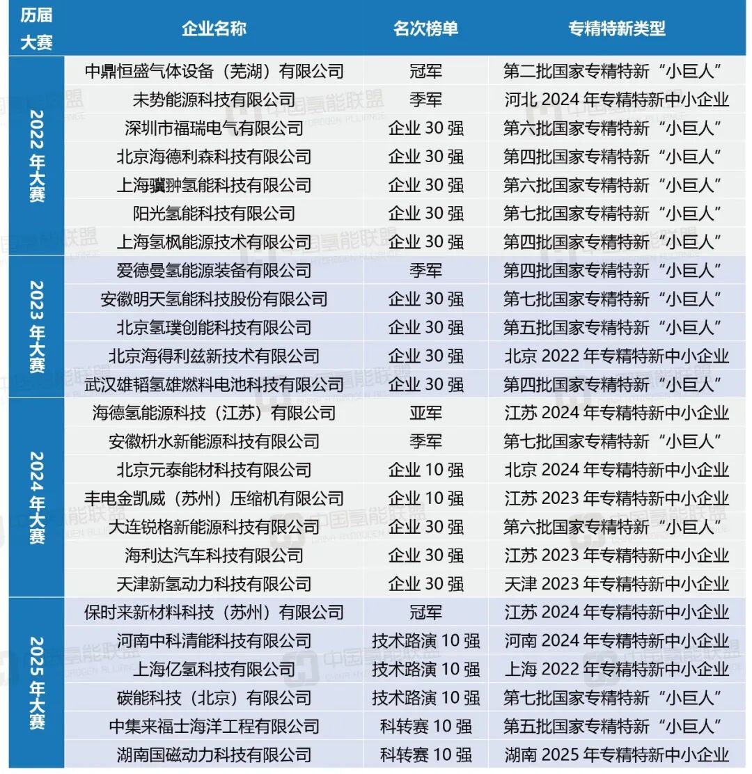 大赛每届发布冠亚季军、企业30强等榜单,其中2022年度大赛冠军中鼎恒盛气体设备(芜湖)有限公司、2023年度大赛季军爱德曼氢能源装备有限公司、2024年度大赛季军安徽枡水新能源科技有限公司分别入选了工信部第五批、第四批、第七批专精特新“小巨人”企业名单,历届企业10强、30强榜单也有多家企业入选。