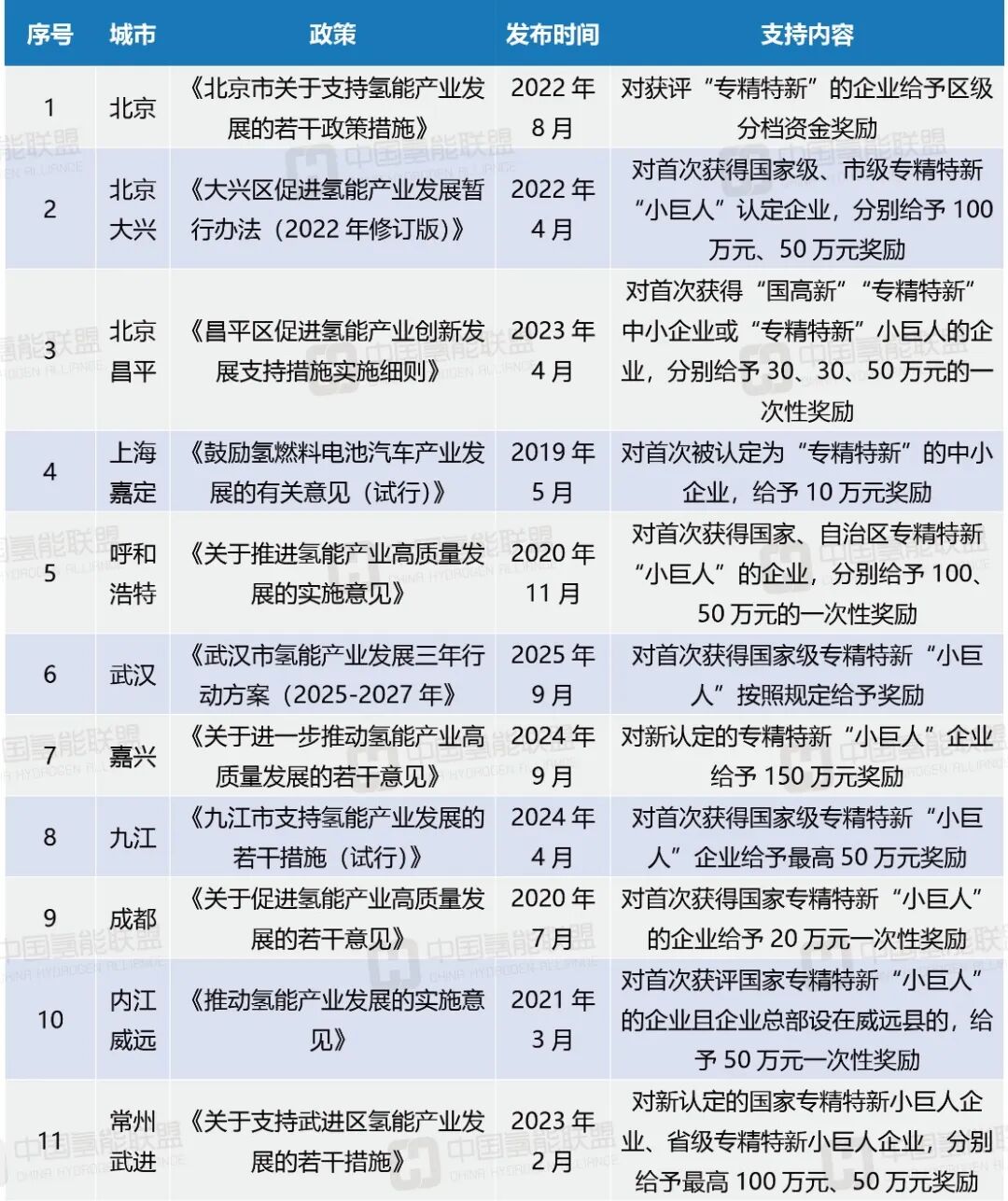 北京、呼和浩特、成都、内江等省市县在相关氢能专项政策中从财政层面给予“专精特新”企业一定奖励和支持,方式主要通过对获得认定的企业给予直接资金奖励开展;其中,嘉兴奖励力度最大,对新认定的专精特新“小巨人”企业给予150万元奖励。