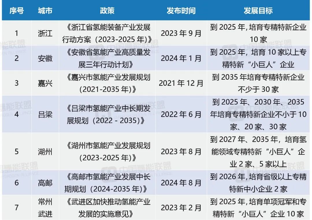 其中,浙江、安徽,嘉兴、吕梁、湖州、高邮,常州武进区等省市县,在发布的氢能专项政策中主要明确了到2025年、2027年甚至到2035年远期“专精特新”企业培育的具体目标。