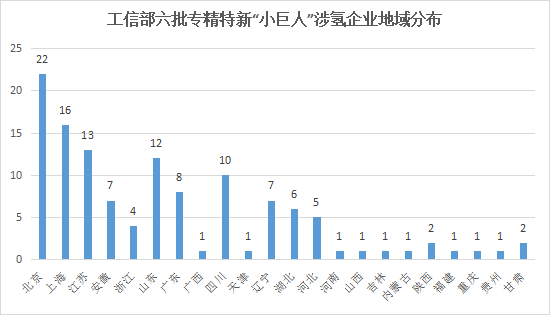 从入选企业地域分布看,六批涉氢专精特新“小巨人”主要分布在北京、上海、江苏、山东、四川、广东、安徽、湖北、河北等地区,分别拥有22、16、13、12、10、8、7、6、5家,占历年上榜涉氢企业总量的94%,整体上覆盖了京津冀、长三角、大湾区、能源金三角、五大燃料电池汽车示范群以及山东、四川、湖北等氢能发展主要先行区、集群区。另外,河北、广东、江苏、山东、湖北和四川等省内相关区域入选了国家能源局能源领域氢能试点(第一批),从专精特新企业发展层面也体现了这些地区推动氢能发展的力度与成效。