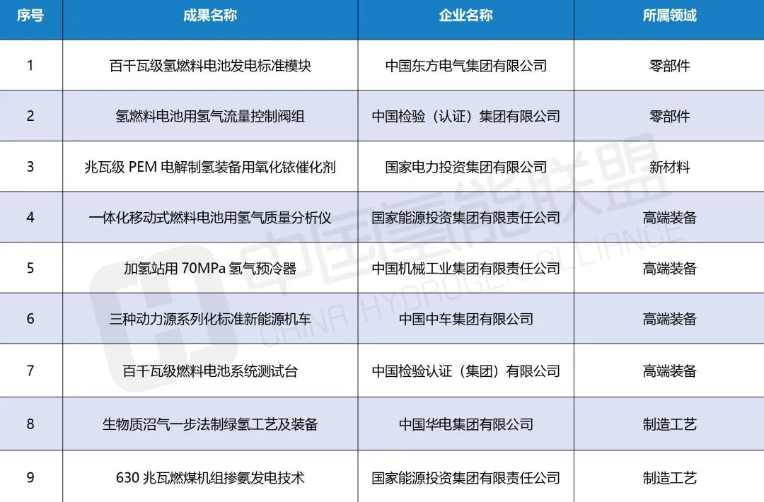根据《成果目录》,本次入选的氢能技术装备如下: