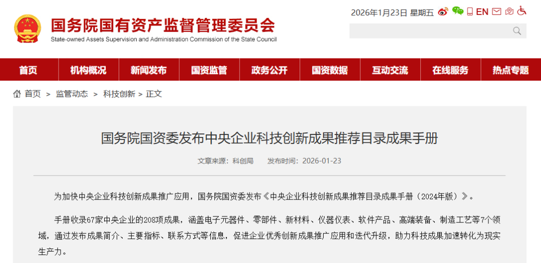 关注 | 国务院国资委发布中央企业科技创新成果推荐目录成果手册